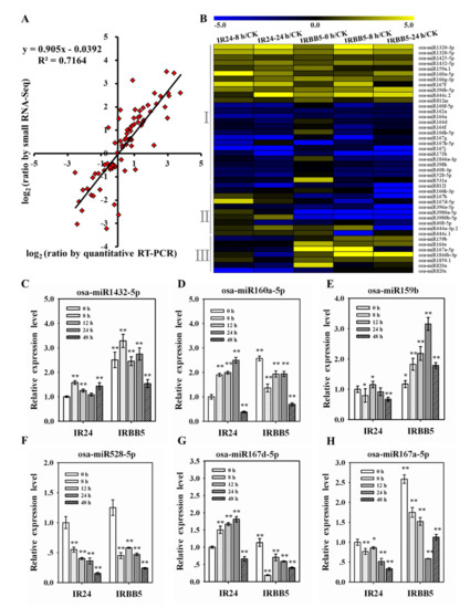 The responsive expression changes of miRNAs after Xoo infection. (A) The correlation analysis of miRNA expression level between small RNA sequencing and qRT-PCR experiments. (B) Heat map of the documented miRNAs with |log2 (fold change ratio)| ≥ 1.5 across Xoo infection. Yellow and blue colors represent up-regulated and down-regulated expression level, respectively. CK represents IR24-0 h. (C and F) The expression profile of basal immunity regulators, osa-miR1432-5p and osa-miR528-5p, in response to the Xoo strain. (D and G) The expression profile of negative immunity regulators, osa-miR160a-5p and osa-miR167d-5p, in response to the Xoo strain. (E and H) The expression profile of positive immunity regulators, osa-miR159b and osa-miR167a-5p, in response to the Xoo strain. The miRNA expression levels in all samples were quantified relative to IR24-0 h. Bars represent mean ± standard deviation (n = 3 independent biological replicates). Asterisks indicate a statistically significant difference (student t-test, ** p < 0.01, * p < 0.05).