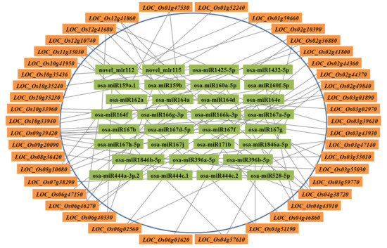 The Xoo-responsive regulatory units of miRNA/targets in infected rice plants. Numbers in internal block with light green color were miRNAs. The genes in outer block represent the targets for the counterparts in the line.