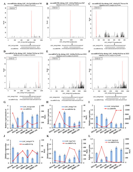 Common miRNAs, including 121 known miRNAs and nine predicted miRNAs, existed in small RNA and degradome sequencing data throughout Xoo-infected early stage (Table S5). Integrating analysis on those data found that 80 miRNA/target regulatory units, encompassing 29 known miRNAs and 38 targets, and four possible miRNA/target regulatory units, including two novel miRNAs and four targets, may be responsive to Xoo strain PXO86 invasion in rice (Figure 5, Table S6). Practically, in a particular miRNA/target regulatory unit, cleavage site identification of target gene is the precondition that miRNAs successfully execute their silencing function. To verify the reliability of putative Xoo-responsive regulatory unit, six unit members, osa-miR164a/LOC_Os12g41680 (OsNAC60), osa-miR159b/LOC_Os01g59660 (OsGAMYB), osa-miR1432-5p/LOC_Os03g59770, osa-miR167a-5p/LOC_Os04g57610 (OsARF8), LOC_Os09g39420 (OsWD40-174), and osa-miR167d-5p/LOC_Os09g39420 (OsWD40-174) were randomly selected to show cleavage events via the degradome sequencing. In target plots (T-plots), miRNA-directed transcript cutting events were detected in corresponding position (Figure 6A–F). The inverse correlation of expression pattern between miRNA and targets was ascertained by qRT-PCR analysis, in which six miRNA/target modules displayed that all target genes were negatively regulated by corresponding miRNAs (Figure 6G–L). These results suggested that vast miRNA/target regulatory units may authentically exist in rice-Xoo interaction.