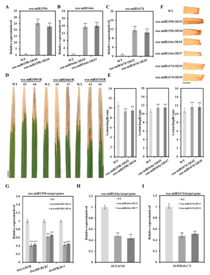 Multiple disease phenotype mediated by osa-miR159b, osa-miR164a and osa-miR167d-5p in overexpressing transgenic plants. (A–C) The excessive accumulation of osa-miR159b, osa-miR164a and osa-miR167d-5p in overexpressing transgenic lines. The wild-type (WT) Taipei 309 was used as control. (D and E) Diverse disease phenotypes caused by the Xoo strain PXO86 in different overexpressing transgenic lines. Lesion lengths for 45 diseased leaves in 15 plants were statistically analyzed at 14 dpi. (F) The histochemical detection of H2O2 using 3,3′-diaminobenzidine (DAB) staining in WT and overexpressing transgenic lines after Xoo infection. Scale bar, 1 cm. (G–I) The relative expression levels of targets in overexpressing transgenic lines. Bars represent mean ± standard deviation (n = 3 independent biological replicates). Asterisks indicate a statistically significant difference (student t-test, ** p < 0.01, * p < 0.05).