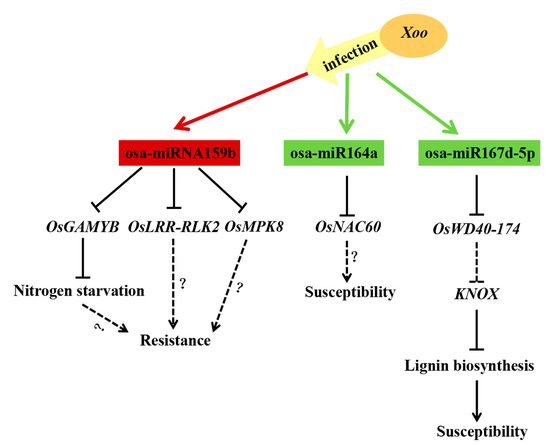 The potential work model of osa-miR159b, osa-miR164a and osa-miR167d-5p mediated immunity pathways upon Xoo infection. The up-regulated and down-regulated miRNAs are shown in red and green, respectively. Solid lines and dashed lines separately represent confirmative and putative regulatory links in rice or Arabidopsis.