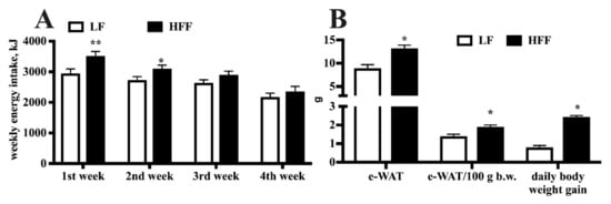 Weekly energy intake (A), epididymal white adipose tissue (e-WAT) weight and body weight gain (B) in middle-aged rats fed low fat (LF) or high fat-high fructose (HFF) diet for four weeks. Values are the means ± SEM of eight rats. * p < 0.05, ** p < 0.01 compared to low-fat diet (two-way ANOVA followed by Tukey post-test for energy intake data and two-tailed Student’s t-test for e-WAT weight and daily body weight gain data).