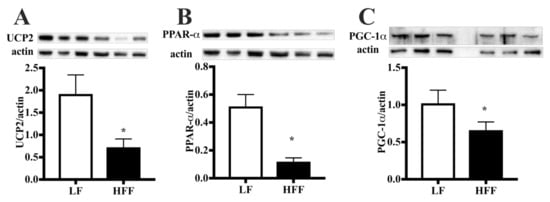 Key proteins involved in the regulation of adipocyte function, namely uncoupling protein 2 (UCP2), peroxisome proliferator-activated receptor alpha (PPAR-α), and peroxisome proliferator-activated receptor gamma coactivator 1-alpha (PGC-1α), were found to be downregulated in HFF rats compared to rats fed low fat (LF) diet (Figure 2).