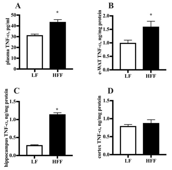 Levels of tumor necrosis factor alpha (TNF-α) detected by enzyme-linked immunosorbent assayin plasma (A), epididymal white adipose tissue (e-WAT) (B), hippocampus (C), and frontal cortex (D) from middle-aged rats fed low fat (LF) or high fat-high fructose (HFF) diets for four weeks. Values are the means ± SEM of eight rats. * p < 0.05 compared to low-fat diet (two-tailed Student’s t-test).