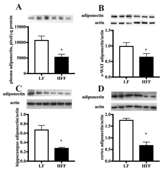 Protein content (with representative western blot) of adiponectin in plasma (A), epididymal white adipose tissue (e-WAT) (B), hippocampus (C), and frontal cortex (D) from middle-aged rats fed low fat (LF) or high fat-high fructose (HFF) diets for four weeks. Plasma adiponectin was detected by using 5 μL of sample. Values are the means ± SEM of eight rats. * p < 0.05 compared to low-fat diet (two-tailed Student’s t-test).