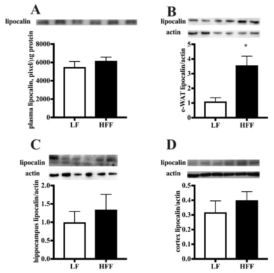 Protein content (with representative western blot) of lipocalin in plasma (A), epididymal white adipose tissue (e-WAT) (B), hippocampus (C), and frontal cortex (D) from middle-aged rats fed low fat (LF) or high fat-high fructose (HFF) diet for four weeks. Values are the means ± SEM of eight rats. * p < 0.05 compared to low-fat diet (two-tailed Student’s t-test).