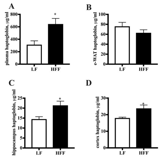 Levels of haptoglobin detected by enzyme-linked immunosorbent assay in plasma (A), epididymal white adipose tissue (e-WAT) (B), hippocampus (C), and frontal cortex (D) from middle-aged rats fed low fat (LF) or high fat-high fructose (HFF) diet for four weeks. Values are the means ± SEM of eight rats. * p < 0.05 compared to low-fat diet (two-tailed Student’s t-test).