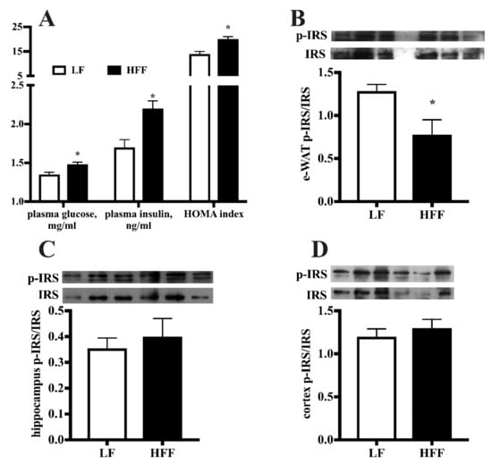 Plasma levels of glucose and insulin and Homeostatic model assessment (HOMA) index (A), protein content (with representative western blot) of phosphorylated Insulin Receptor Substrate (p-IRS) in epididymal white adipose tissue (e-WAT) (B), hippocampus (C), and frontal cortex (D) from middle-aged rats fed low fat (LF) or high fat-high fructose (HFF) diet for four weeks. Values are the means ± SEM of eight rats. * p < 0.05 compared to low-fat diet (two-tailed Student’s t-test).