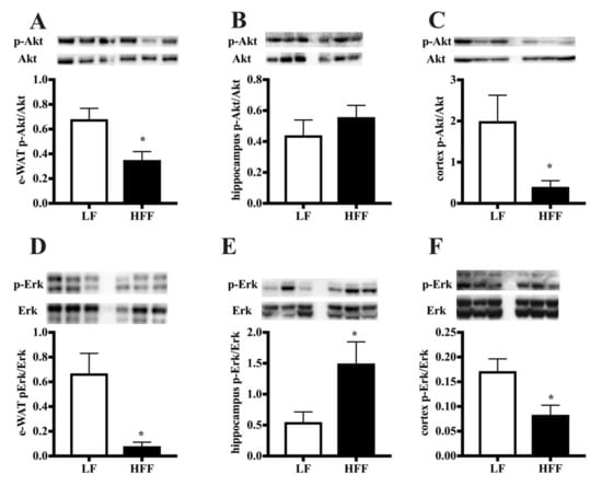 Protein content (with representative western blot) of phosphorylated Akt (p-Akt) and Erk (p-Erk) in epididymal white adipose tissue (e-WAT) (A,D), hippocampus (B,E), and frontal cortex (C,F) from middle-aged rats fed low fat (LF) or high fat-high fructose (HFF) diets for four weeks. Values are the means ± SEM of eight rats. * p < 0.05 compared to low-fat diet (two-tailed Student’s t-test).