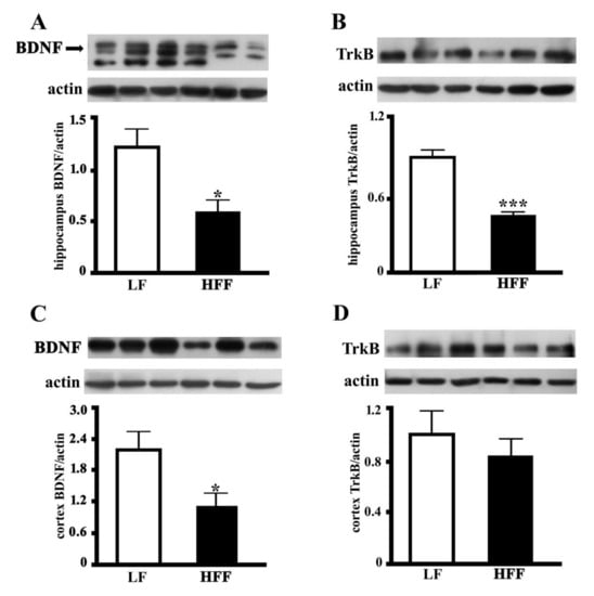 BDNF is a key cerebral factor involved in a wide range of neurophysiological processes and has a multipotent impact on brain signaling and synaptic plasticity []. The BDNF level was measured in both the hippocampus and frontal cortex, and a significant diet dependent decrease was observed (Figure 9A,C). We also analyzed adipose tissue samples for the presence of BDNF, but we detected only a very faint band (data not shown). At present, we cannot say whether this very faint band reflects a small amount of BDNF produced locally in e-WAT or a small amount coming from the plasma. Further work is required to discriminate between the two options. We further investigated whether the dietary treatment could affect the amount of TrkB receptor, as BDNF activities, such as enhancement of synaptic plasticity, neuroprotection, and stimulation of neuronal fibers growth, are mediated by neurotrophin binding to this receptor []. As shown in Figure 9B, TrkB level was significantly lower in the hippocampus of HFF rats, while it was not affected by diet in the frontal cortex (Figure 9D).