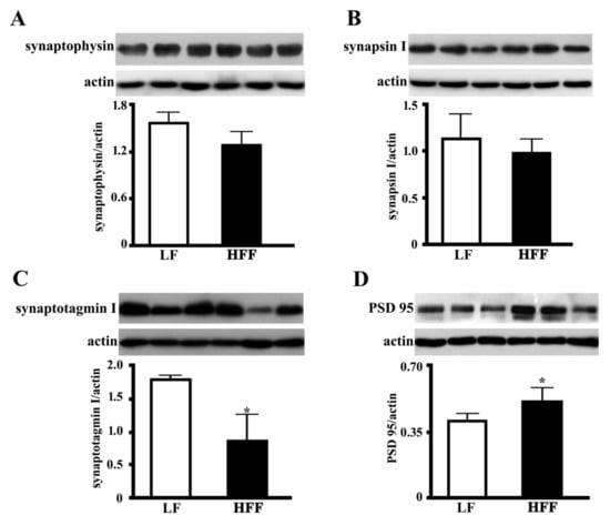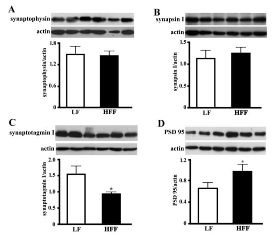 In order to clarify the impact of HFF diet on key markers of synaptic function, the levels of presynaptic proteins synaptophysin, synapsin I and synaptotagmin I, and post synaptic density protein 95 (PSD-95) were measured in hippocampus and frontal cortex of HFF and control rats. Synaptophysin and synapsin I are involved in synaptic growth, as they play key roles in synapse formation, maturation, and maintenance []. Synaptotagmin I is a major calcium sensor for transmitter release at central synapse and is also crucial for clamping synaptic vesicle fusion in mammalian neurons []. HFF diet did not affect synapsin I or synaptophysin level, while it was associated with a marked decrease of synaptotagmin both in the hippocampus (Figure 10) and the frontal cortex (Figure 11). In the next step, we examined the level of PSD-95, a key protein for the function of neurotransmitter receptors []. Interestingly, we found that the expression PSD-95 was significantly increased in hippocampus (Figure 10) and frontal cortex (Figure 11) of HFF rats.