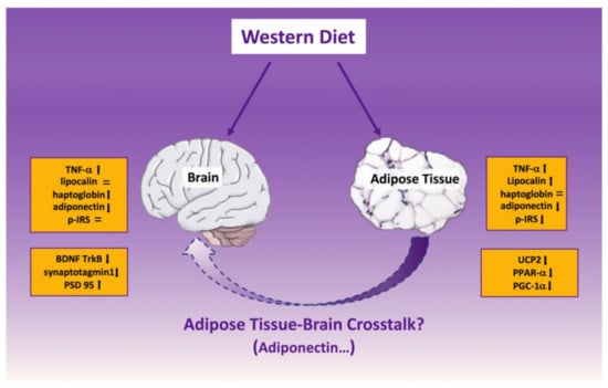 The increased risk for obese individuals to develop brain disease might be due to the capacity of adipose tissue to communicate with the brain and impact its function. Therefore, the analysis of specific markers, whose adipose and/or brain levels are affected by diet, might contribute to unveil the intersection between obesity and neurodegeneration. In particular, proinflammatory cytokines, namely tumor necrosis factor alpha (TNFα), are implicated in the development of neuronal insulin resistance [,]. Since both cytokines and insulin in the brain regulate synaptic plasticity, learning and memory, neuroinflammation and neuronal insulin resistance have been proposed to be involved in obesity-associated brain impairment [].