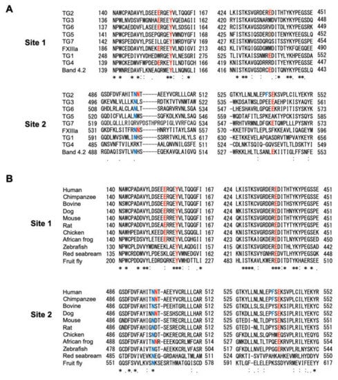 Multiple sequence alignment of the Ca2+-binding sites in transglutaminases. (A) Inter-isotype comparison of the human TG family. (B) Inter-species comparison of TG2. The amino acid sequence of TG2 was analyzed using Clustal Omega. Conserved Ca2+-binding amino acid residues (red characters) and similar amino acid residues are highlighted in red. Ca2+-binding amino acids in main chains are shown as blue characters. Asterisk (*), a conserved residue; Colon (:), a strongly similar residue; Period (.), a weakly similar residue.