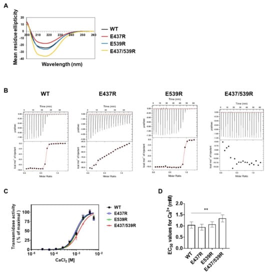 Binding of Ca2+ to E437 and E539 is required for the transamidase activity of TG2. (A) CD spectra of recombinant TG2 proteins. (B) Comparison of Ca2+-binding affinity between wild-type, E437R, E539R, and E437/539R using ITC. (C) Ca2+-dependent transamidase activities of TG2. The transamidase activities were measured in various concentrations of CaCl2 as described in Materials and Methods. (D) EC50 values for Ca2+ were calculated using GraphPad Prism software. Error bars are 95% CI of the EC50. One-way ANOVA with a Tukey post hoc test was used; ** p < 0.01.
