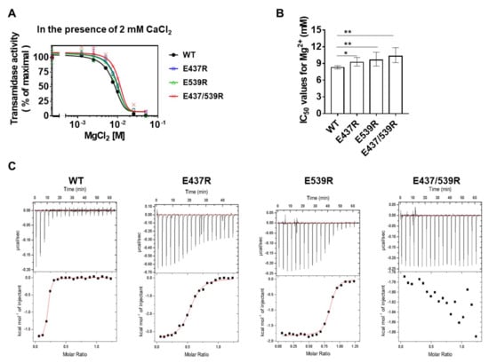 Binding of Mg2+ to E437 and E539 inhibits Ca2+-dependent transamidase activity of TG2. (A) Inhibition of transamidase activities of wild-type, E437R, E539R, and E437/539R by increasing Mg2+. Transamidase activities were measured in various concentrations of MgCl2 as described in Materials and Methods. (B) IC50 values for Mg2+ were calculated using GraphPad Prism software. Error bars are 95% CI of the IC50. One-way ANOVA with a Tukey post hoc test was used; * p < 0.05, ** p < 0.01. (C) Comparison of Mg2+-binding affinity of the wild-type and mutant TG2 using ITC.