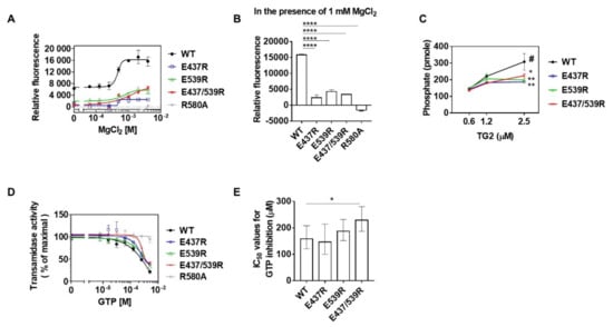 Binding of Mg2+ to E437 and E539 promotes GTP binding and hydrolysis activity of TG2. (A,B) Effect of Mg2+ on GTP-binding activities of the wild-type, E437R, E539R, and E437/539R. GTP binding activity was assessed using BODIPY FL GTP-γ-S, a GTP analogue, which fluoresces upon binding to proteins. The TG2 proteins were incubated with BODIPY FL GTP-γ-S at various concentrations of MgCl2. Fluorescence intensities were plotted against the MgCl2 concentration (A) and were selected at 1 mM MgCl2 for the bar graph (B). A GTP-binding defective R580A mutant was used as the negative control. One-way ANOVA with a Tukey post hoc test was used. Data represent the mean ± SEM; **** p < 0.0001. (C) GTP hydrolytic activity of wild-type and mutant TG2. Activity was determined by measuring the amount of phosphates released from GTP. Two-way ANOVA with a Tukey’s multiple comparisons test was used. Data represent the mean ± SEM; * p < 0.05 and ** p < 0.01 compared with the wild-type (#) at 2.5 μM TG2. (D) Inhibition of transamidase activities of TG2 by GTP. The transamidase activities were measured in various concentrations of GTP in the presence of 2 mM CaCl2 and 1 mM MgCl2 as described in Materials and Methods. (E) The IC50 values for GTP were calculated using GraphPad Prism software. One-way ANOVA with a Tukey post hoc test was used. Error bars are 95% CI of the IC50; * p < 0.05.