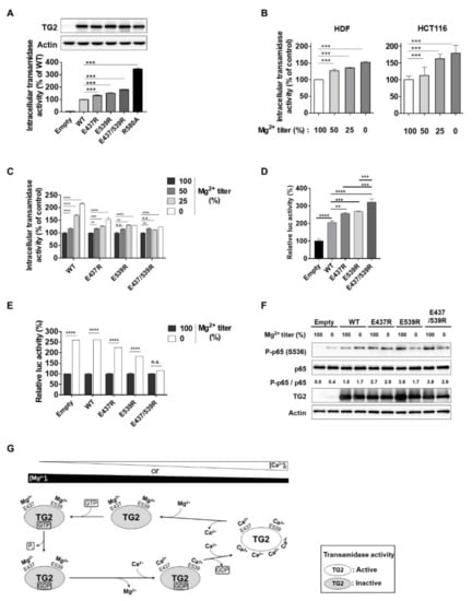 TG2 activates the NF-κB signaling pathway that leads to various inflammatory diseases, such as bleomycin-induced lung inflammation and UV-induced skin inflammation, through production of pro-inflammatory cytokines [,]. To evaluate the role of Mg2+-binding in the regulation of NF-κB signaling, we compared the NF-κB luciferase reporter activity in HEK293 cells transfected with WT and mutant TG2. Cells expressing TG2 mutants, especially E437/539R, exhibited significantly higher levels of reporter activity than cells expressing WT-TG2 (Figure 6D). Moreover, Mg2+ depletion in culture media resulted in about a 2.6-fold increase in the luciferase reporter activity of cells transfected with WT-TG2. In contrast, this effect of Mg2+ depletion was abrogated in cells expressing E437/539R (Figure 6E). To confirm these results, we compared the effect of Mg2+ depletion on the level of p65 phosphorylation in cells expressing the WT and mutant TG2. When cultured in normal media, the levels of p65 phosphorylation in cells expressing mutant TG2 were higher than those in cells expressing WT-TG2. In contrast, when cultured in Mg2+-free media, p65 phosphorylation was increased in cells expressing WT-TG2, but not in cells expressing E437R, E539R, or E437/539R (Figure 6F). These results indicate that Mg2+-binding to E437 and E539 of TG2 is crucial in preventing aberrant activation of the NF-κB signaling pathway.
