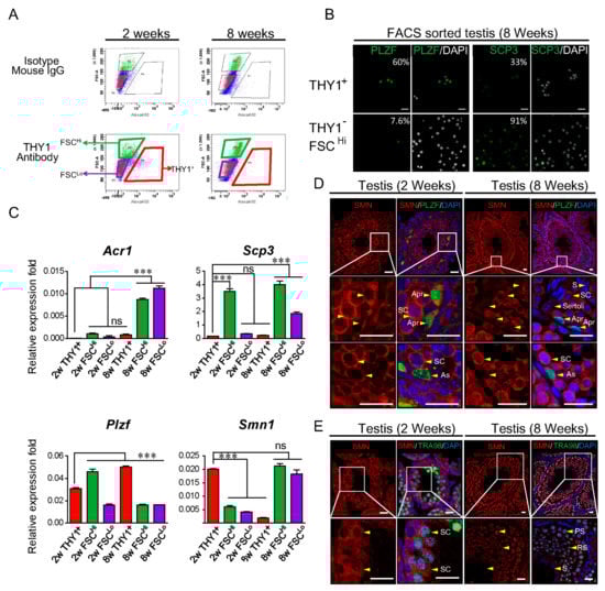 Testis from 2- and 8-week-old C57BL/6JNarl mice (NLAC) were digested by Collagenase IV and Trypsin, incubated with rat anti-CD90.2 (THY1) antibody (553011, BD Biosciences, San Jose, CA, USA) or isotype rat IgG (559072, BD) control, and then labeled with anti-rat 488 secondary antibody (A21208). Cells were placed into an FACS tube for isolation with three populations, including THY1+ SSCs, THY1−FSCHi spermatocyte, and THY1−FSCLo sperm/spermatids/spermatocyte, by an FACS Aria III Sorter (BD). Dead cells stained with propidium iodide (PI, 1 μg/mL) signals were excluded.
