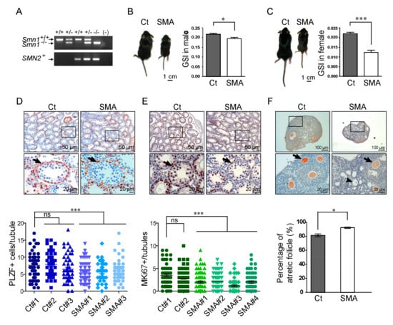 Testes and ovaries in SMA-like mice are abnormal. (A) Genotype of wildtype Smn1+/+;SMN2−, Smn1+/−;SMN2+ (littermate control, Ct), and Smn1−/−;SMN2+ (SMA-like) mice are confirmed by PCR. (-) indicates the negative control without a template. (B) Male SMA-like mice (indicated as SMA) with a phenotype has a smaller body size and significantly lower GSI than their heterozygote littermates (Smn1+/−SMN2+, indicated as Ct) at the age of 2 weeks (n = 4 Ct and 7 SMA mice). (C) The body size of female SMA-like mice (left panel), and the GSI of ovaries at 8 weeks after birth (right panel, n = 3 Ct and 4 SMA mice). (D) Reduction of PLZF-expressing germ cells (red color, arrows in larger magnification field) is shown in SMA-like mice but not in their heterozygote littermates after IHC analysis. Lower panel indicates its quantification. Each spot indicates the number of PLZF-expressing cells in each seminiferous tubule. Seminiferous tubules ranging from 100 to 150 μm are used for counting (n = 3 mice per genotype). (E) The expression of the proliferation marker, MKi67 (red color, arrow), is weaker in surrounding spermatogonia cells on the basal membrane of SMA-like mice than heterozygote controls. Hematoxylene was used as a counterstain (blue) (n = 2 for Ct and 4 for SMA). The negative control of IHC is shown in Supplementary Figure S3. (F) IHC staining demonstrates low SMN protein levels (red color, arrow) in the immature oocytes in SMA-like mice. The percentage of atretic follicles (atresia) was quantified (lower panel). * Indicates a statistically significant difference, p < 0.05. ***, p < 0.001.