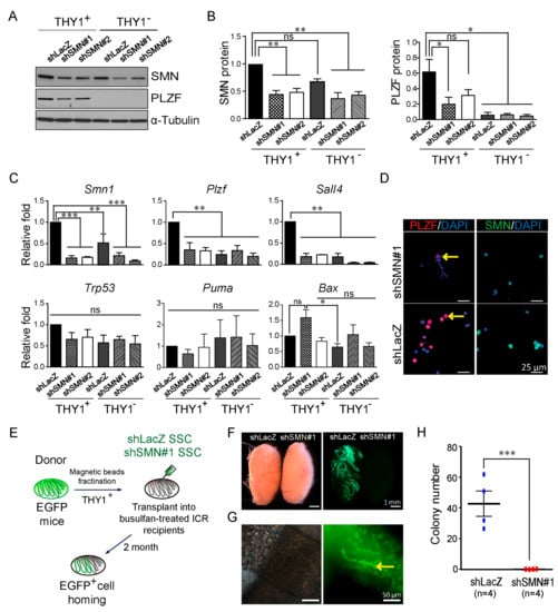 Considering the convenience of obtaining SMN-deficient spermatogonium, we performed knockdown of Smn1 in magnetic-activated cell sorting (MACS) isolated spermatogonial stem cells (SSCs) of C57/BL6 mice to evaluate the effects of SMN depletion. Antibody-enriched THY1+ SSCs were used for lentiviral-based knockdown experiments. shSMN lentivirus-transduced SSCs displayed lower expression levels of SMN and PLZF protein in the Western blotting analysis (Figure 3A,B), consistent with the result shown in the SMA-like mouse model in Figure 2. THY1− cells, which contain spermatocyte and somatic cells, did not express PLZF and showed lower expression after SMN knockdown (Figure 3A,B). The RNA levels of Smn1, sal-like protein 4 (Sall4), and Plzf genes were also decreased following SMN knockdown in THY1+ cells (Figure 3C), which was consistent with the Western blotting analysis and immunofluorescent staining results (Figure 3D). Of note, apoptotic markers, such as transformation-related protein 53 (Trp53), BCL2-binding component 3 (Bbc3, also known as Puma), and BCL2-associated X protein (Bax), had similar levels in the Smn1 knockdown and control groups (Figure 3C).