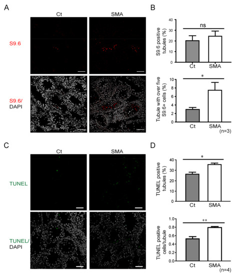 Accumulation of the RNA:DNA hybrid structure, R-loop, was a recently identified phenomenon in SMN-deficient cells due to the increased transcription termination, which is concomitant with the induction of the p53 pathway and DNA damage response, manifesting as γ-H2A.X activation and U12-mediated intron retention [,,,]. Because SMN is a key component of R-loop resolving, which affects transcription termination and may further contribute to cell proliferation [,], we tested whether SMN depletion leads to an increase of the R-loop in SMA-like mice. The IHC staining (Figure 4A) against the R-loop structural marker, S9.6, showed no significant differences between SMA-like mice and littermate controls in the total number of S9.6-positive tubules (Figure 4B, upper panel). However, a significantly higher amount of the R-loop structure appeared in the testis of SMA-like mice, which contained over five S9.6-positive cells per tubule (Figure 4B, lower panel). Terminal deoxynucleotidyl transferase dUTP nick end labeling (TUNEL) staining, which detects DNA fragmentation, which is usually associated with apoptosis, was analyzed in the testis of SMA-like mice. We observed a significant increase in the percentage and average number of TUNEL-positive cells per tubule (Figure 4C,D). These data demonstrated that a deficiency of SMN would form abundant R-loop structures, which may contribute to the disruption of RNA transcription, and lead to massive cell death in testicular cells.
