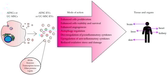 Our synthetic review points to the most important mechanisms of extracellular vesicles activity, which has been identified following their administration in several neurological, cardiovascular, liver, kidney, and skin injuries. Moreover, there is currently growing evidence supporting important role of extracellular vesicles derived from ADSCs and UC-MSCs in other conditions including in bone regeneration [,,] and cancers [,,], indicating similar mechanisms to be involved (summarized in Figure 1).