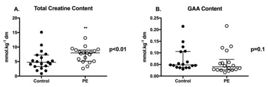 Total creatine content of PE placentae was significantly higher (+38%) than controls (Figure 1A; p < 0.01). Placental content of GAA (creatine precursor) was not significantly different between PE and control cohorts (Figure 1B). Baby sex had no effect on placental creatine or GAA content in either control or PE pregnancies.