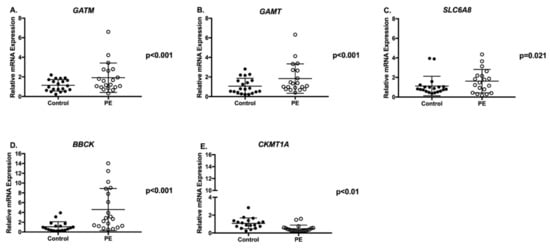 Placental Gene Expression of the Creatine Synthesizing Enzymes, the Creatine Transporter and Kinases. Creatine synthesizing enzymes GATM gene that codes for AGAT (A) and GAMT (B), the creatine transporter SLC6A8 (C), cytosolic creatine kinase BBCK (D) and mitochondrial creatine kinase CKMT1A (E). n = 20 normotensive control (closed circle) and n = 20 PE (open circle). Data are presented relative to the control cohort. Values are mean ± SD. Wilcoxon Rank Sum was used for statistical comparison. Significance was set at p ≤ 0.025, following a Benjamini-Hochberg adjustment for false-positives.