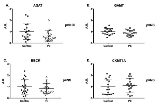 Placental Protein Expression of the Creatine Synthesizing Enzymes and Kinases. Creatine synthesis enzymes AGAT (A) and GAMT (B), cytosolic creatine kinase BBCK (C) and mitochondrial creatine kinase CKMT1A (D). n = 19 normotensive control (closed circle) and n = 19 PE (open circle). Data were normalized to total protein and a control sample run across blots. Data are expressed in arbitrary units (A.U.) relative to the control cohort. Wilcoxon Rank Sum was used for statistical comparison. Significance was set at p ≤ 0.025, following a Benjamini-Hochberg adjustment for false-positives. NS: not significant.