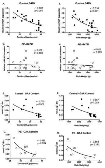 We explored associations between placental metabolite content, gene and protein expression, and then these laboratory measures with maternal characteristics (age, parity, mode of delivery) and pregnancy outcomes (baby sex, gestational age, birth weight and placental weight). There was a significant decrease in placental GATM mRNA expression with advancing gestational age (Figure 4A, r = −0.681; p < 0.001) and birth weight (Figure 4B, r = −0.610; p < 0.001) in controls. These gene associations were absent in the PE cohort (Figure 4C,D). Similar correlations were observed with placental GAA, with tissue content declining with advancing gestational age (Figure 4E, r = −0.720; p < 0.002) and birth weight (Figure 4F, r = −0.687; p < 0.003) in normotensive controls. These associations were again absent in the PE cohort (Figure 4G,H). Placental creatine content was not significantly associated with any other maternal characteristics or pregnancy outcomes. Nor were mRNA expression patterns of GAMT, SLC6A8, BBCK, CKMT1A or AGAT, GAMT, BBCK or CKMT1A protein abundance.