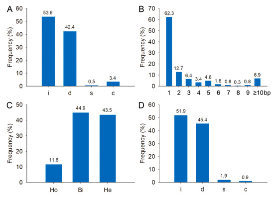 Sequencing analyses revealed that most mutations were short indels; 62.3% of indels were 1 bp changes (Figure 1A,B). A majority of the 1 bp insertions (83.2%) were either A or T, which is consistent with previous reports [27,29].