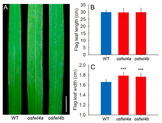 Additionally, the flag leaf width of osfwl4a and osfwl4b mutants was 7.7% and 6.3% greater, respectively, than that of the WT (Figure 3A,C). However, there was no marked difference in flag leaf length (Figure 3B). Analysis of leaf epidermal cell size revealed no significant difference in cell length and width between WT and mutants (Figure S4). This suggests that the increase in leaf width of mutants was caused by an increase in cell number but not in cell size. In addition, the plant height of mutants was slightly reduced compared with that of the WT (Figure 2A and Figure S5).