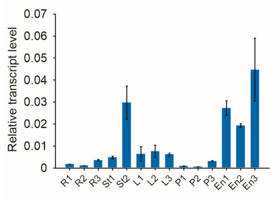 qRT-PCR results of the OsFWL4 gene in 14 tissue samples of japonica rice Zhonghua 11. The rice Actin1 gene was used as the internal control. Legend: R1–R3, roots in the seedling, tillering, and heading stages, respectively; St1 and St2, stems in the jointing and heading stages, respectively; L1–L3, leaves in the seedling, tillering, and heading stages, respectively; P1–P3, panicles 5, 15, and 20 cm in length, respectively; En1–En3, endosperms 5, 14, and 21 days after pollination. Error bars are standard deviations of three technical repeats.