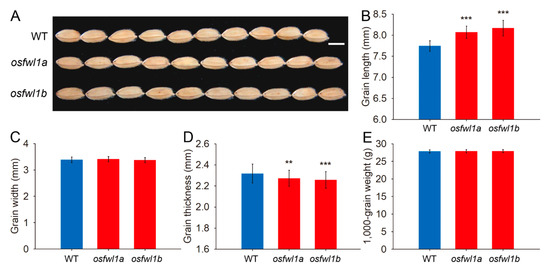 Grain length of osfwl1a and osfwl1b mutants was 4.2% and 5.5% greater, respectively, than that of the WT (Figure 5A,B). However, there was no difference in grain width between the mutants and WT plants (Figure 5C). Grain thickness of mutants was slightly lower than that of the WT (Figure 5D). Finally, there was no change in the 1000-grain weight of mutants (Figure 5E). Additionally, plant height, leaf size, and grain yield per plant of mutants were not considerably different from those of the WT (Figure S6).