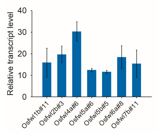 The presence of CRISPR/Cas9 DNA and marker genes in gene-edited plants may cause adverse effects, such as an increased risk of off-target changes, and may trigger regulation concerns when these plants are used in crop breeding [22,31,32]. To test whether the T-DNA fragment carrying the CRISPR/Cas9 construct could be segregated out in the progeny of T0 mutants, the presence of HPT, sgRNA, and Cas9 transgenes in T1 plants derived from one of the homozygous or bi-allelic T0 mutants of each target (except Osfwl3a) was examined (Figure S2). For target Osfwl3a, the progeny of a chimeric T0 plant (Osfwl3a#4) were used. The genotype of the T0 mutant for each T1 line used is shown in Table S1. Transgene-free plants were obtained in several randomly selected T1 progeny for all lines (Figure S2), suggesting that the number of T-DNA insertion loci was low in T0 plants.