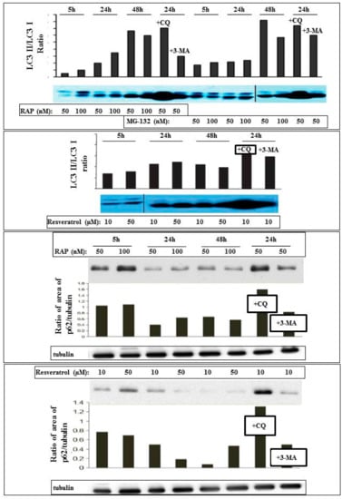 The autophagy inducing effect of resveratrol could be further confirmed by increased LC3II/I ratio and decreased p62 expression. This induction was similar to that caused by rapamycin and proteasomal inhibition treatment with MG-132 (Figure 2).