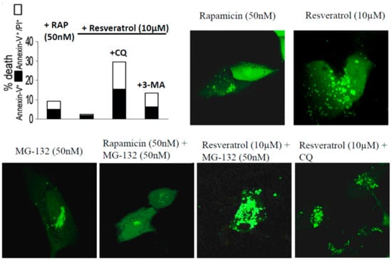 ARPE-19 cells treated by rapamycin (RAP), resveratrol, MG-132, and chloroquine (CQ). The LC3 expression is shown in green using the pDENDRA-LC2 expression vector. Cell death analysis is carried out using Annexin-FITC/propidium iodide expression under the difference treatments.