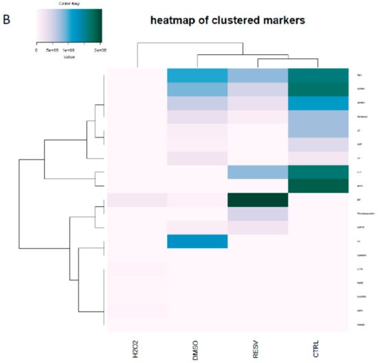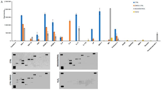 Supernatants of the cell cultures treated by H2O2, DMSO, or resveratrol were collected, centrifuged and stored frozen until cytokine detection. The secreted factors were determined by Human XL Cytokine Array (Proteome Profiler, R&D Systems, Minneapolis, MN, USA) according to the manufacturers’ protocol and the pixel density in each spot of the membranes was measured by ImageJ software and results were analyzed by hierarchical clustering. Hierarchical clustering based on the pixel density levels was performed by R software [35]. Full list of analytes is found in the Supplementary Materials Table S1.