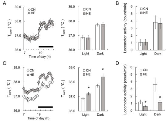 Before starting heat exposure, we first observed that Tcore did not differ between control (CN) and heat-exposed (HE) rats (Figure 1A). Mean Tcore in the light and dark phase of CN and HE also did not differ between the groups (Figure 1A, light phase, p = 0.80; dark phase, p = 0.80). As shown in Figure 1B, locomotor activity did not differ between the groups before heat exposure in both the light and dark phases (Figure 1B, light phase, p = 0.80; dark phase, p = 0.57). Heat exposure significantly increased Tcore (Figure 1C) in both the light (p < 0.05) and dark phases (p < 0.05). During heat exposure, Tcore was consistently higher in the HE group than in the CN group (Supplementary Figure S1). Conversely, heat exposure decreased locomotor activity (Figure 1D) in both the light (p < 0.05) and dark phases (p < 0.05).