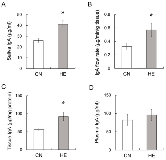 Salivary immunoglobulin A (IgA), IgA flow rate, IgA in the submandibular glands (SMGs) and plasma IgA levels in control (CN) and heat-exposed (HE) rats. (A) IgA concentration in saliva. (B) IgA flow rate. (C) IgA concentration of the SMGs and (D) plasma. Values are presented as the mean ± SEM (n = 8 in each group). * p < 0.05, significant difference between the CN and HE groups.