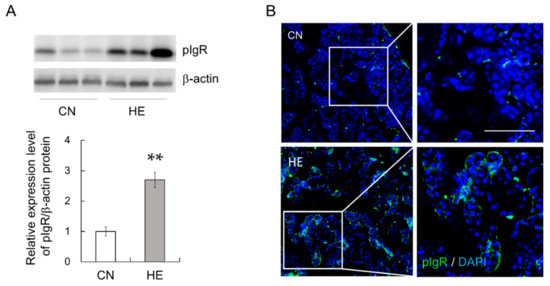 Polymeric immunoglobulin receptor (pIgR) expression in the submandibular glands (SMGs) of control (CN) and heat-exposed (HE) rats. (A) pIgR protein expression in the SMGs. Heat exposure increased pIgR protein expression in the SMGs. Left 3 lanes show CN rats, and right 3 lanes show HE rats. Values are presented as the mean ± SEM (n = 8 in each group). ** p < 0.01, significant difference between the CN and HE groups. (B) Immunohistochemical analysis of pIgR (green) in the SMGs. The nuclei were stained with 4′,6-diamidino-2-phenylindole (DAPI, blue). The right panel shows magnified views of the boxed regions from the CN and HE groups. Scale bar, 25 µm.