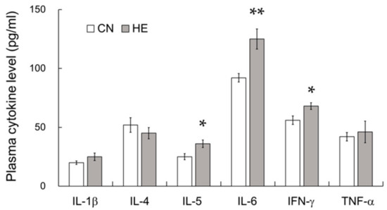 Plasma cytokine levels of control (CN) and heat-exposed (HE) rats. Plasma interleukin (IL)-1β, IL-4, IL-5, IL-6, interferon-γ (IFNγ), and tumor necrosis factor-α (TNFα) levels in the CN and HE groups. Plasma IL-5, IL-6, and IFNγ expression was significantly higher in the HE group than in the CN group. Values are presented as the mean ± SEM (n = 8 in each group). * p < 0.05, ** p < 0.01, significant difference between the CN and HE groups.