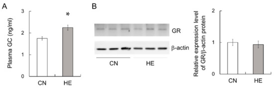 It has been reported that the 5′-flanking region of the pigr gene contains a response element to GCs [12]. This class of hormones, which includes corticosterone, is known to increase the expression of pIgR [4]. Thus, plasma GC levels were measured in CN and HE rats using ELISA. The plasma GC level was significantly higher in the HE group than in the CN group (Figure 5A), whereas GR protein level in the SMGs was not changed by heat exposure (Figure 5B).
