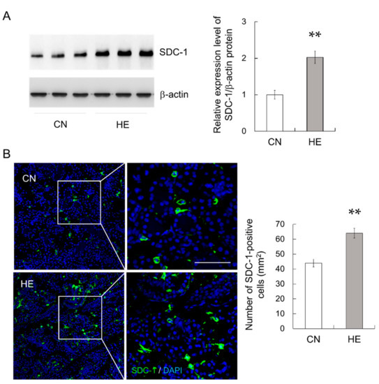 SDC-1, also known as CD138, is a useful marker for plasma cells because it is expressed in the late stages of B-cell differentiation with progression toward plasma cells [30]. Because plasma cells produce IgA in the salivary glands [3], we analyzed SDC-1 expression in the SMGs. SDC-1 protein expression in the SMGs was significantly higher in the HE group than in the CN group (Figure 6A, p < 0.01). The immunohistochemical analysis detected SDC-1 in plasma cells and a few epithelial cells exhibited cytoplasmic staining (Figure 6B). The number of SDC-1-positive cells was counted in randomly chosen high-power fields in each tissue and expressed as the number of cells per mm2. The number of SDC-1-positive cells in the SMGs was significantly higher in the HE group than in the CN group (Figure 6B, p < 0.01). In addition, many SDC-1-immunopositive cells were co-labeled with anti-IgA antibody (Supplementary Figure S2).