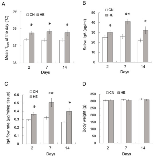 In a different series of the experiments, we additionally investigated that time-lapse of IgA secretion following 2, 7 and 14 days heat exposure. Before heat exposure, there were no significant differences in mean Tcore between the groups. During the 2, 7 and 14 days heat exposure period, Tcore in HE2, HE7, and HE14 rats were constantly higher than those in CN2, CN7, and CN14 rats, respectively (Figure 7A, p < 0.05). The salivary IgA concentration (Figure 7B, p < 0.05) and IgA flow rate (Figure 7C, p < 0.05) were increased during the first 2 days of the heat exposure period and remained elevated for at least 14 days. Body weight of HE14 rats was slightly lower than that of CN14, albeit without significance (Figure 7D, p = 0.232).