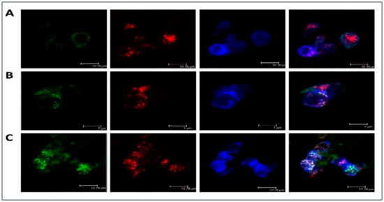 Low-density lipoprotein (LDL) accumulation in human monocyte-derived primary macrophages. Immunofluorescent staining was performed on primary human monocyte-derived macrophages and analyzed by confocal microscopy. Cells were cultured with native (B) or atherogenic LDL (C) or without LDL (A) for 3 h. Staining with anti-ApoB antibody was shown in green, staining with anti-Stabilin-1 was shown in red, staining with anti-EEA1 was shown in blue.