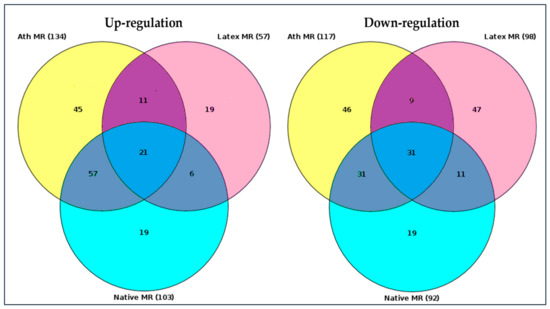 Venn diagram of master regulators identified. Native MR—master regulators identified upon the interaction (incubation) of cultured monocyte-derived macrophages with native LDL. Ath MR—master regulators identified upon the interaction (incubation) of cultured monocyte-derived macrophages with naturally occurring LDL isolated from the blood of atherosclerotic patients. Latex MR—master regulators identified upon the interaction (incubation) of monocyte-derived macrophages with latex beads. The total number of identified up- and down-regulated master regulators was shown in brackets (gene nomenclature can be found in the Supplementary Materials section). Darker colors indicated regulation of genes which coincided (diagram overlaps).