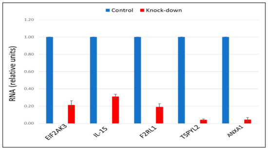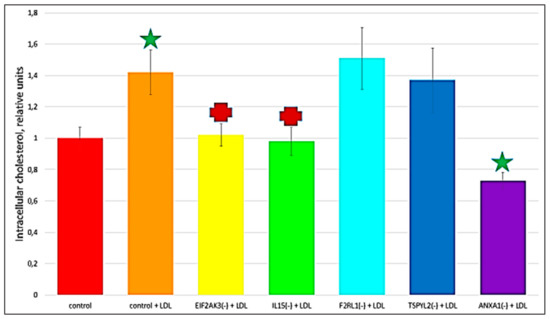 The recent study conducted by our research group identified genes (IL15, EIF2AK3, F2RL1, TSPYL2, and ANXA1) encoding inflammatory molecules that were upregulated upon treatment of macrophages with atherogenic LDL and involved in the development of inflammation and immune response during the foam cell formation [19]. Further knock-down experiments using these genes were included in the present study that would help to elucidate the relationship between processes of the immune response and cholesterol accumulation. Thus, the knock-down effect of five master regulators, such as IL15, EIF2AK3, F2RL1, TSPYL2, and ANXA1 on the cholesterol accumulation was tested, in order to determine, whether these genes up-regulated upon macrophage interaction with modified LDL could be involved in the accumulation of intracellular cholesterol. Primary macrophages derived from human monocytes were cultured for 24 h with the addition of atherogenic naturally occurring LDL and the significant accumulation of cholesterol was observed in these cells. The knock-down of the EIF2AK3 and IL15 genes completely prevented cholesterol accumulation in cultured macrophages. The knock-down of the ANXA1 gene caused the most significant decrease in the cholesterol content (lowered basal cholesterol) in cultured macrophages. At the same time, knock-down of F2RL1 and TSPYL2 did not cause any effects. Figure 4 illustrated the knock-down effect of IL15, EIF2AK3, F2RL1, TSPYL2, and ANXA1 genes on intracellular lipid accumulation. In addition, the knock-down efficiency of IL15, EIF2AK3, F2RL1, TSPYL2, and ANXA1 genes was reflected in Figure 5.