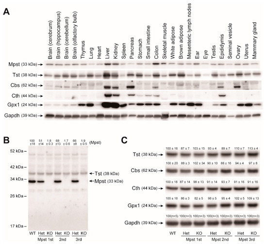Tissue expression of mercaptopyruvate sulfurtransferase (Mpst) and related proteins in adult wild-type and Mpst mutant mice. All samples were taken from males except for the ovary, uterus, and mammary gland. (A) Western blot analysis of Mpst, Tst (thiosulfate sulfurtransferase), Cbs (cystathionine β-synthase), Cth (cystathionine γ-lyase), Gpx1 (glutathione peroxidase 1), and Gapdh (glyceraldehyde-3-phosphate dehydrogenase; as a loading control) in various mouse tissues. (B) Western blot analysis of the liver Mpst (and Tst) in wild-type (WT), heterozygous (Het), and homozygous (KO) Mpst mutant mice (1st–3rd lines) using the anti-mouse Mpst rabbit polyclonal antibody produced in this study. Relative amounts of Mpst protein was expressed as % of the WT samples (mean ± SD; n = 3 each). (C) Hepatic expression of Tst, Cbs, Cth, Gpx1, and Gapdh using specific antibodies in WT, Het, and KO mice (1st–3rd lines). Relative expression of each protein was expressed as % of the WT samples (mean ± SD; n = 3 each).