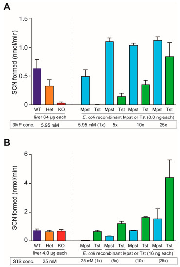 Mpst and Tst (rhodanese) enzyme activities from wild-type (WT), heterozygous (Het), and homozygous (KO) Mpst mutant mice liver homogenates, as well as mouse Mpst/Tst recombinant proteins. (A) Mpst enzyme assay. Although recombinant Tst protein displayed some 3-mercaptopyruvate (3-MP) degradation “Mpst” activities at substrate concentrations over 29.75 mM (5 ×), it did not show any activity at 5.95 mM (1 ×). Under this condition, Mpst gene deletion abolished Mpst-specific activities in liver homogenates from KO mice. (B) Tst enzyme assay. Although recombinant Mpst protein displayed some sodium thiosulfate (STS) degradation “Tst” activities at >125 mM (5 ×), it did not show any activity at 25 mM (1 ×). At this condition, Mpst gene deletion did not alter Tst-specific activities at any STS concentrations tested in liver homogenates from KO mice.